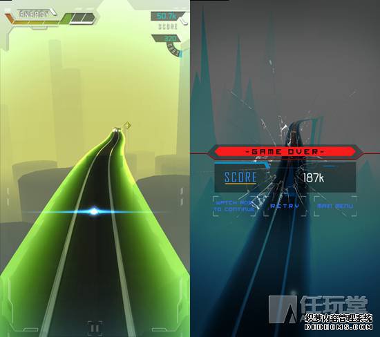 在游戏里,玩家操纵一块三角形状的战机在一条无限长的赛道上展开极速狂奔。赛道分为左中右三部分,,玩家只需点击屏幕两侧即可让战机左右移动,而什么都不做的话战机就会回到中间。